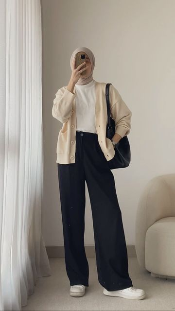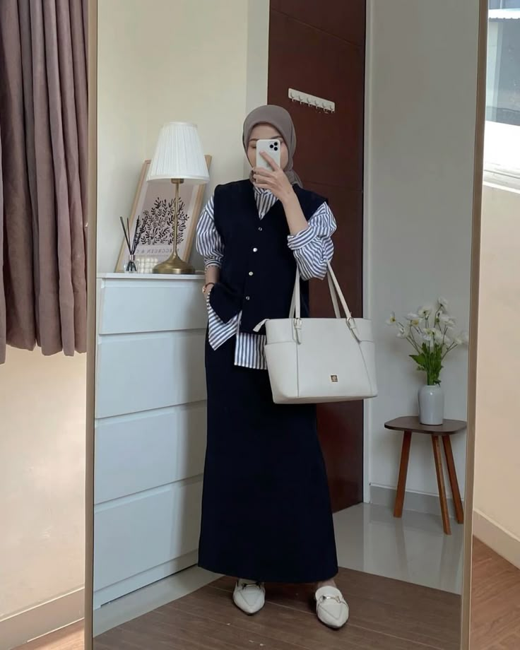 Maxi dress polos bisa jadi pilihan praktis untuk tampilan kasual. Tambahkan outer seperti cardigan panjang atau kimono dengan motif floral untuk sentuhan feminin. Hijab segi empat dengan warna senada akan membuat look ini semakin harmonis. Lengkapi dengan flat shoes atau sandal minimalis untuk kenyamanan sepanjang hari.